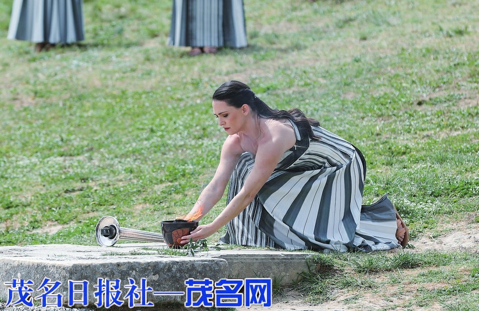 当地时间12时16分,在有2500多年历史的赫拉神庙遗址前,由希腊女演员玛丽·米娜扮演的古希腊女祭司向光明之神阿波罗祈祷后点燃了火种。由于现场多云,火种点燃环节没有采用传统的凹面镜取火,而是选用了此前备用的火种。