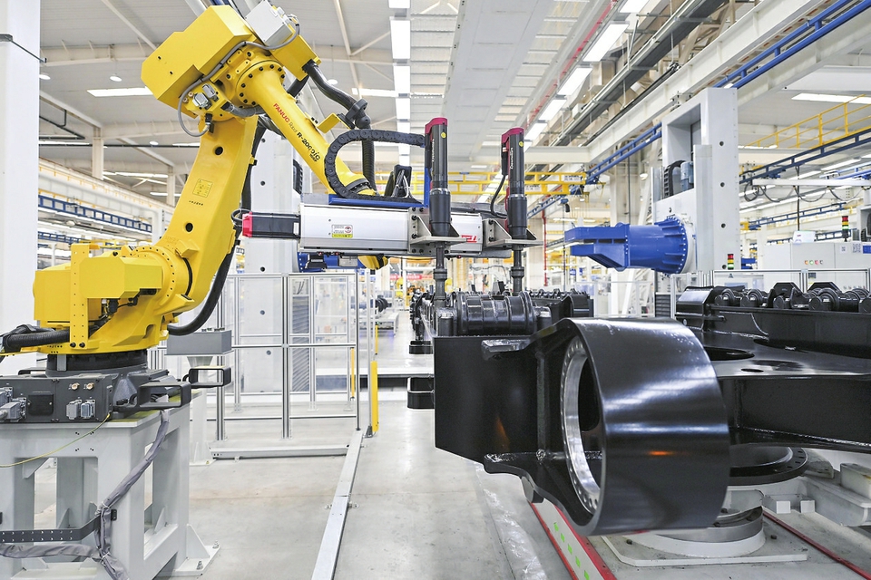 在太重集团智能高端液压挖掘机产业园区内的智能生产线上,智能装配机器人在作业。新华社记者杨晨光摄