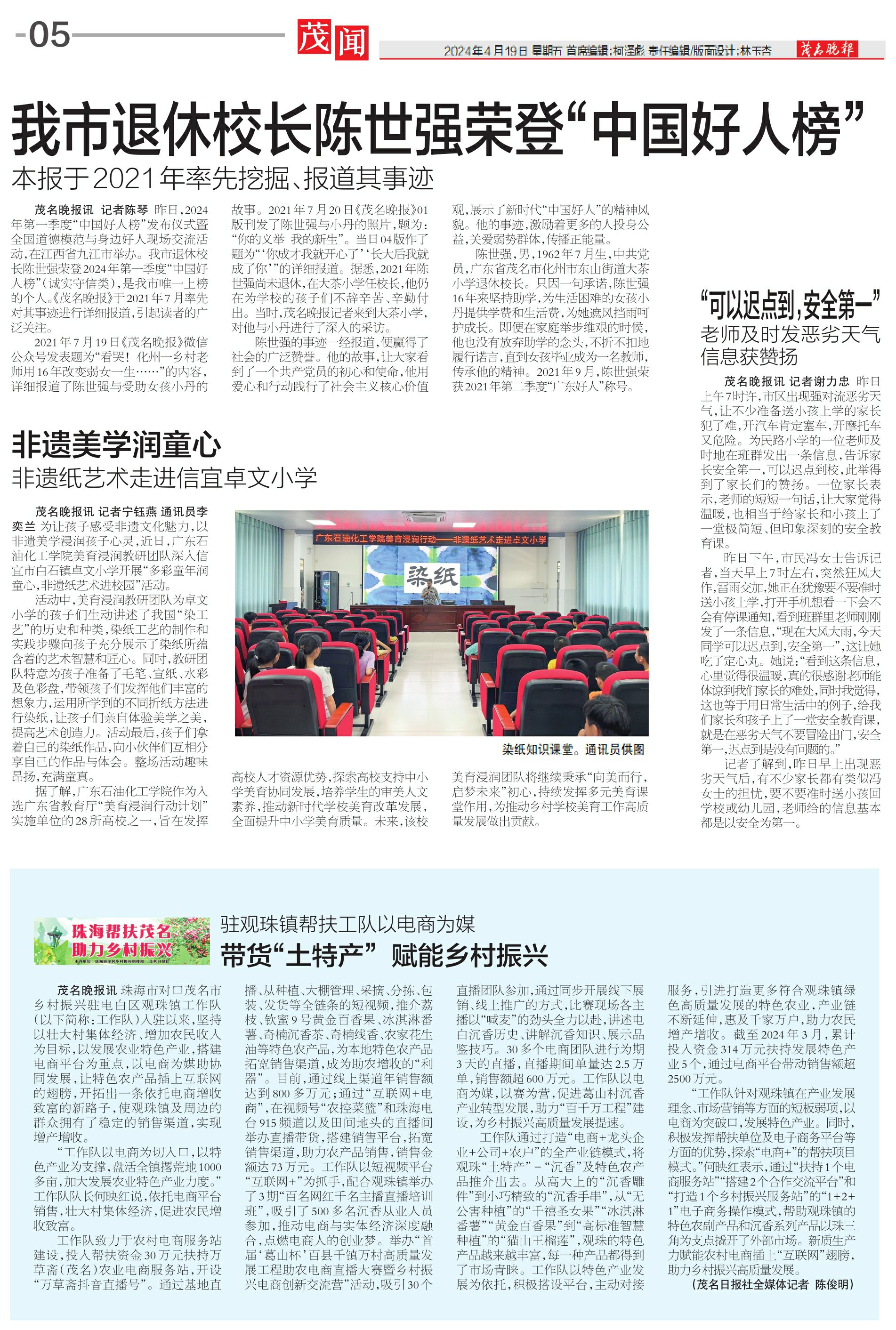 茂名晚报讯记者谢力忠 昨日上午7时许,市区出现强对流恶劣天气,让不少准备送小孩上学的家长犯了难,开汽车肯定塞车,开摩托车又危险。为民路小学的一位老师及时地在班群发出一条信息,告诉家长安全第一,可以迟点到校,此举得到了家长们的赞扬。一位家长表示,老师的短短一句话,让大家觉得温暖,也相当于给家长和小孩上了一堂极简短、但印象深刻的安全教育课。