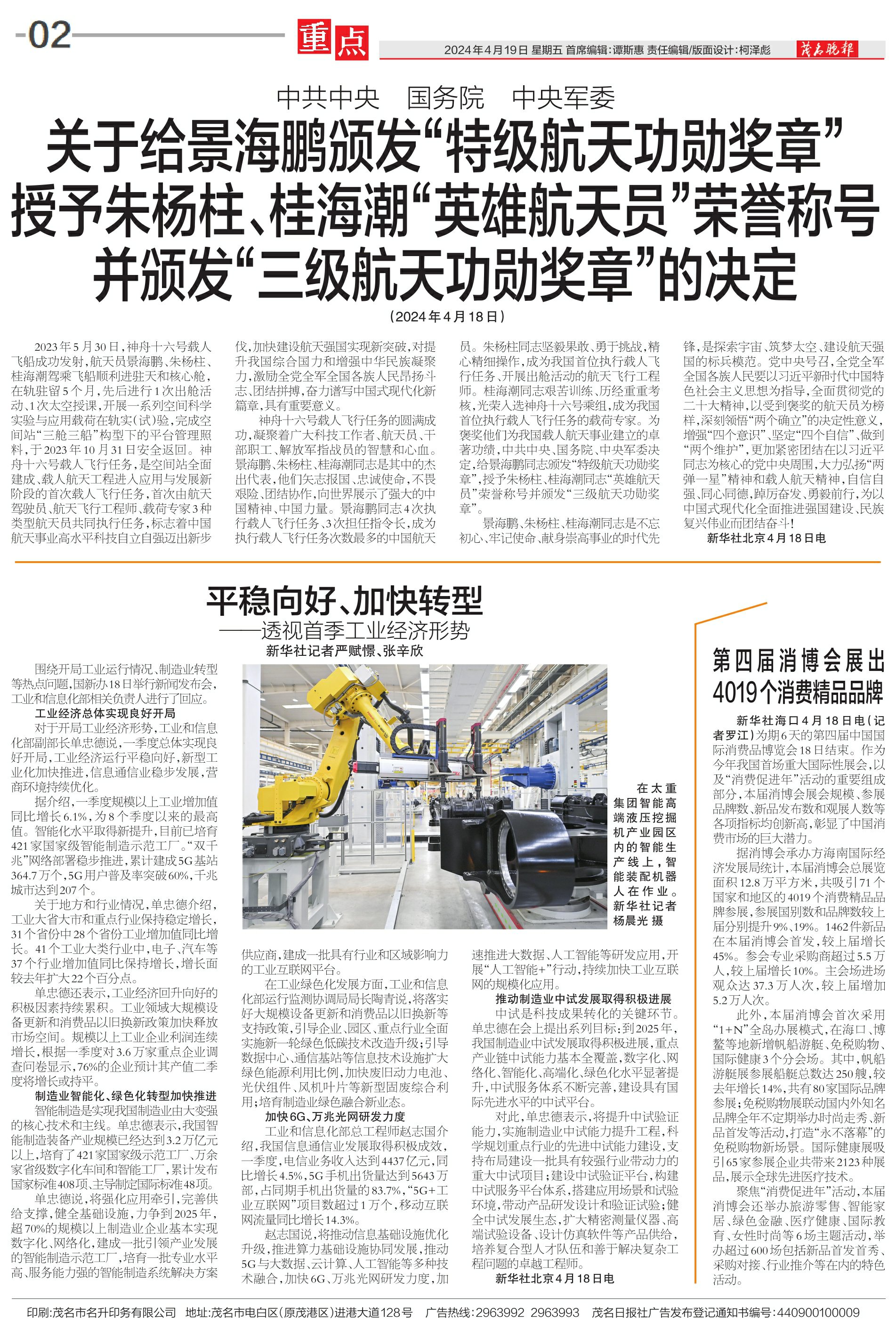关于给景海鹏颁发“特级航天功勋奖章”授予朱杨柱、桂海潮“英雄航天员”荣誉称号并颁发“三级航天功勋奖章”的决定