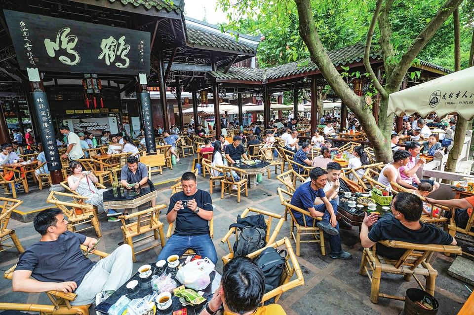 人们在成都市人民公园内的鹤鸣茶社喝茶休闲(2021年6月30日摄)。新华社记者沈伯韩摄