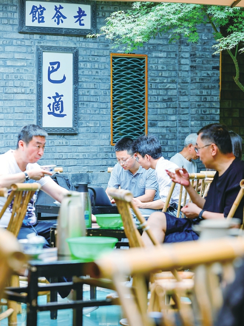 人们在成都太古里大慈寺内的茶社喝茶(2023年6月7日摄)。新华社记者沈伯韩摄