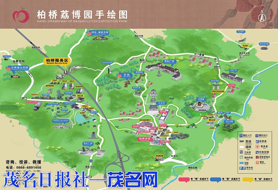 手绘图内里色彩鲜艳,绿色的基调让人看到了绿美茂名。从图上可以看到,柏桥荔博园包括高州特优农产品荔枝、龙眼的主产区,横跨甜美果海乡村振兴示范带上的根子、分界、泗水三个核心乡镇,包茂高速、汕湛高速贯穿其中。图上有红、蓝、黄三种颜色标注的地标,分别为“有‘理’走遍天下”“有‘荔’走遍天下”“有‘丽’走遍天下”。