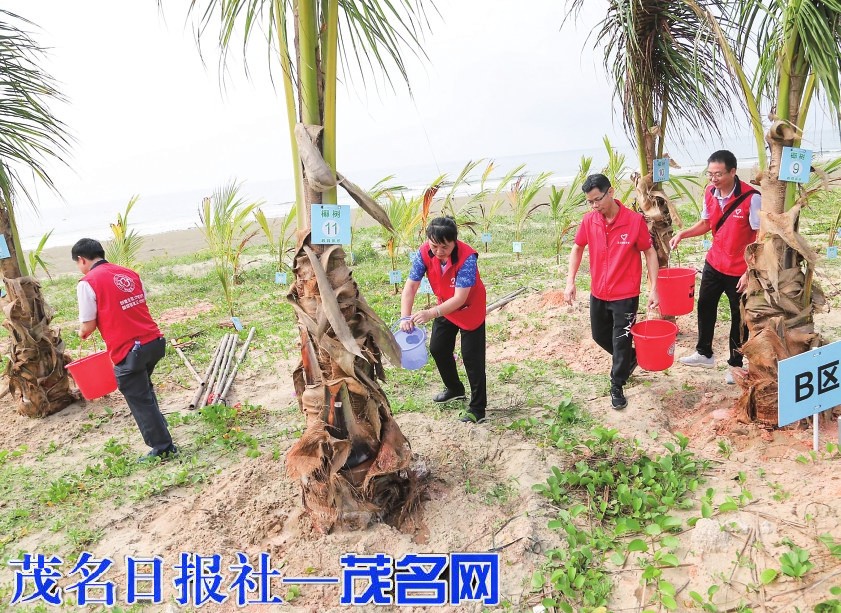 志愿者为植下的椰子树浇水。
