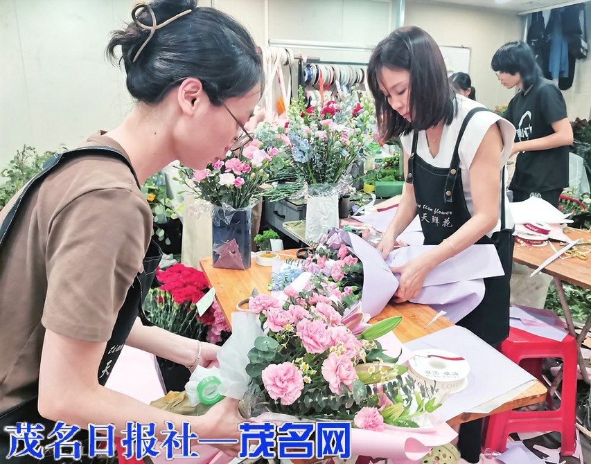 5月12日,市区某鲜花店生意红火,不少市民在花店选购鲜花献给母亲,服务员在忙于包扎鲜花。