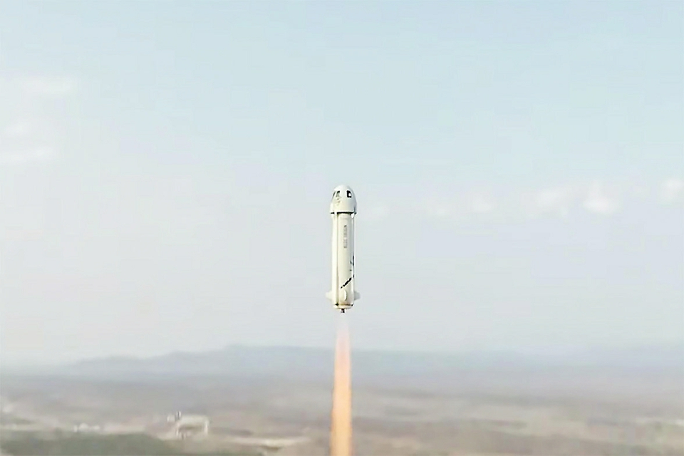 这张美国蓝色起源公司2021年7月20日发布的视频截图显示“新谢泼德”飞行器从美国得克萨斯州西部一处发射场升空,完成首次载人太空试飞。新华社发(蓝色起源公司供图)