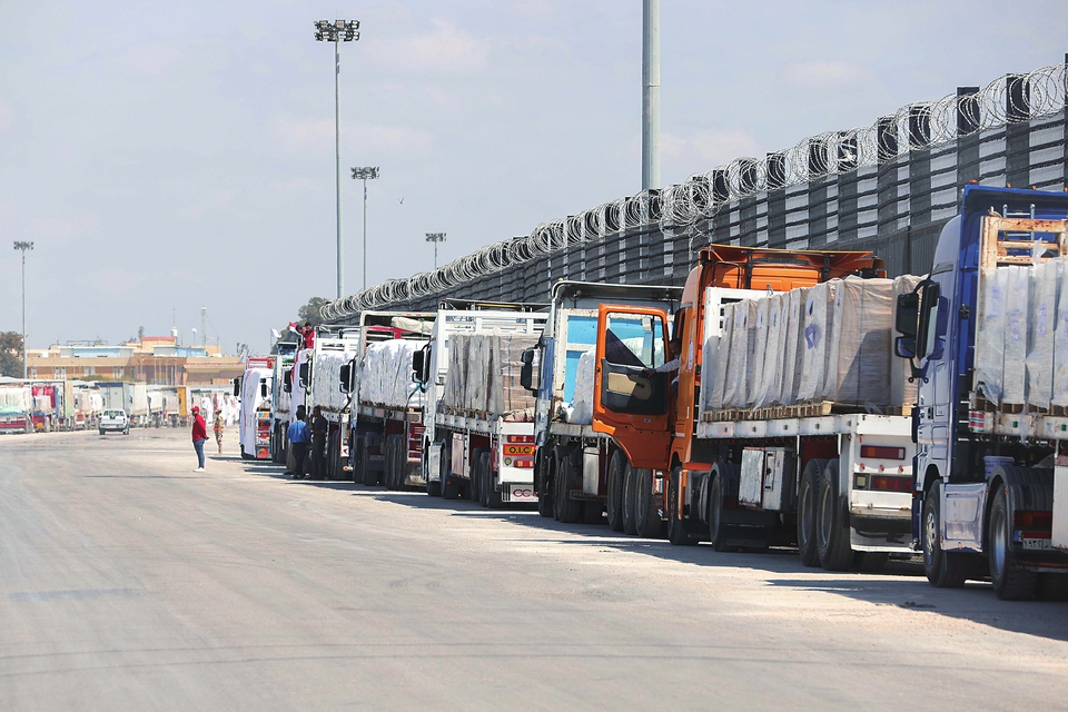 这是3月23日拍摄的停靠在拉法口岸埃及一侧装有援助物资的卡车。新华社发(穆罕默德·艾哈迈德摄)