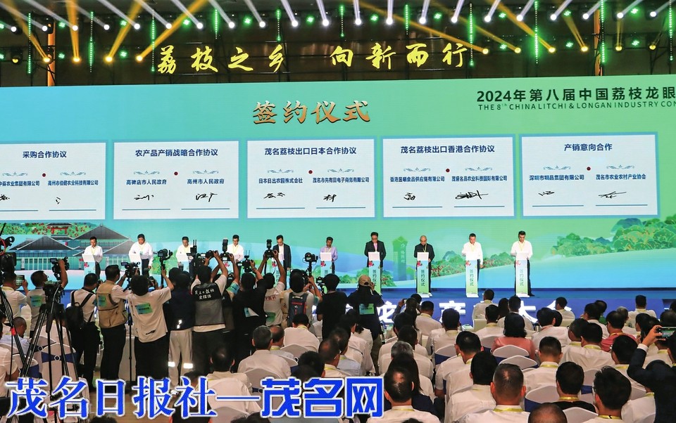 当天,一批合作项目正式签约。包括:中国建设银行广东分行与茂名市茂名墟产业振兴协会签订茂名荔枝定制合作协议;中国邮政集团有限公司广东省分公司与茂名市电子商务协会签订邮政寄递保质提效服务项目;华南农业大学与广州鲜汇冷冻技术有限公司签订广东省荔枝超低温冷冻锁鲜技术研发及应用推进项目;厦门绿帝生态股份有限公司与高州市人民政府签订茂名高州绿帝桂圆荔枝产业链开发运营项目;中国人保财险广东省分公司与广东省供销集团有限公司签订“保险+供销”助力“百千万工程”战略合作协议;广东中荔农业集团有限公司与高州市伯健农业科技有限公司签订采购合作协议;高碑店市人民政府与高州市人民政府签订农产品产销战略合作协议;日本日出农园株式会社与茂名市先有田电子商务有限公司签订茂名荔枝出口日本合作协议;香港昱曦食品供应链有限公司与茂盛名品农业科技国际有限公司签订茂名荔枝出口香港合作协议;深圳市圳品集团有限公司与茂名市农业农村产业协会签订产销意向合作。