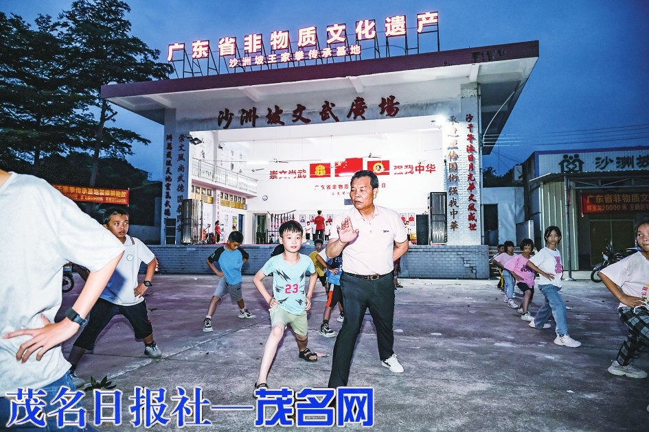 5月25日晚,茂名晚报记者在沙洲坡村文武广场看到,灯火辉煌中,“广东省非物质文化遗产——沙洲坡王家拳传承基地”几个大字格外醒目。广场上,60多名孩子正在跟随教练的步伐,一招一式地练习着武术的基本动作。压腿、扎马步、打拳……每一个动作都显得那么认真和专注。