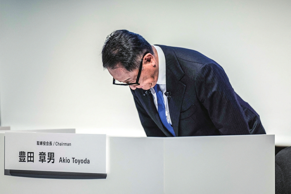 6月3日,丰田汽车公司会长(董事长)丰田章男在东京召开的记者会上鞠躬道歉。新华社/法新
