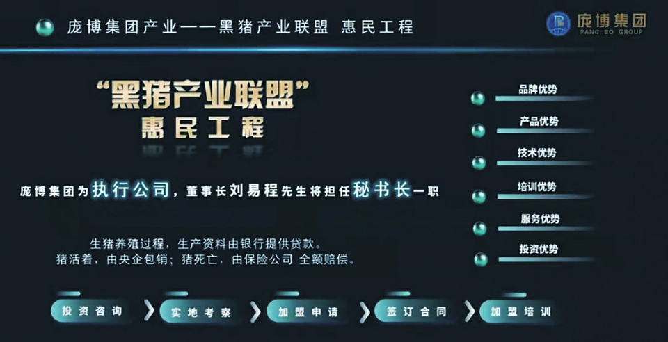 ——夸大实体产业,骗取投资者信任。民警在侦查中发现,“禾元农场”初期并未养殖任何黑猪,后有团队人员提出,需要凭借实体养猪场提高项目可信度。于是该公司开始与养猪场签订“合作协议”,营造有“实体产业”的形象。民警前往这些养猪场调查发现,养殖规模不到1万头。但“禾元农场”的后台数据显示,认养规模已经达到上百万头。就在案发前,“庞博集团”还在东部某省与一国企大谈“合作”。