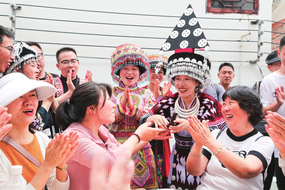 6月10日,在云南水富市两碗镇三角村,当地人向游客敬上苗家米酒。 新华社发(狄廷秀摄)