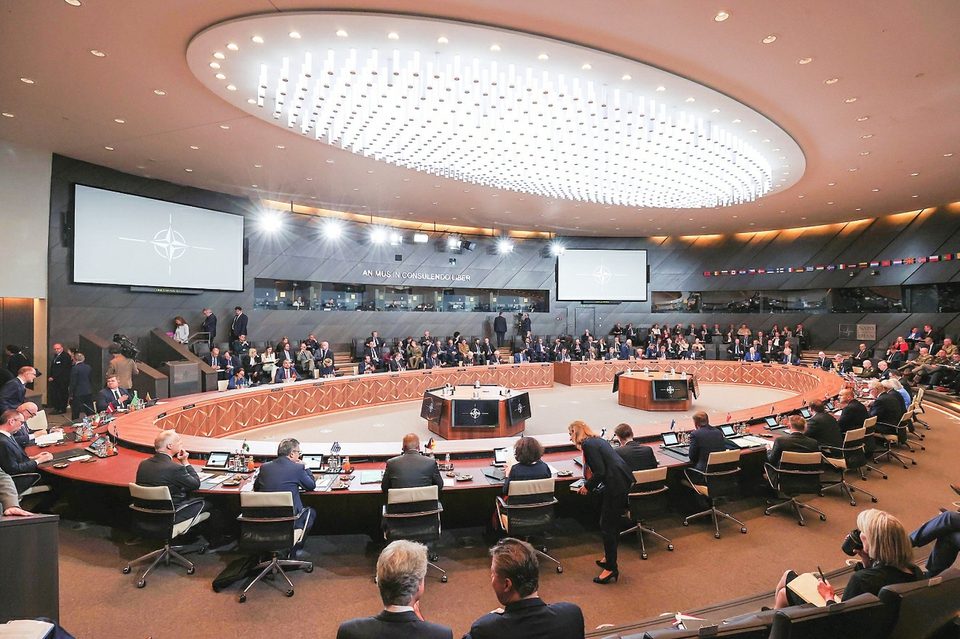 这是 6 月14日在比利时布鲁塞尔北约总部拍摄的北约 防 长 会 现场。北约秘书长斯托尔滕贝格14日说,北约成员国国防部长当天批准了一项旨在由北约协调对乌克兰军事援助和训练的计划。北约防长会13日至14日在布鲁塞尔举行。 新华社记者赵丁喆摄