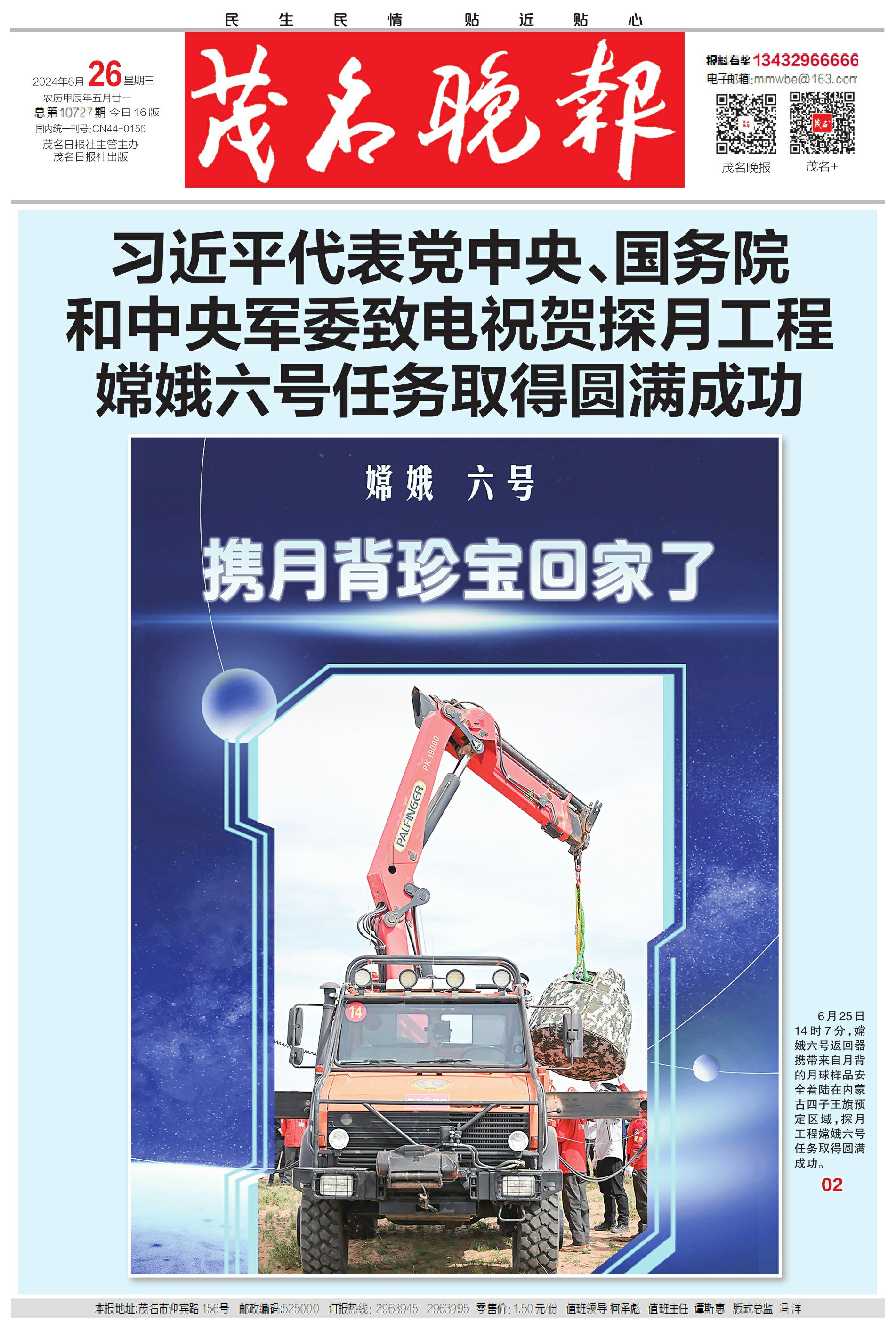习近平代表党中央、国务院和中央军委致电祝贺探月工程嫦娥六号任务取得圆满成功