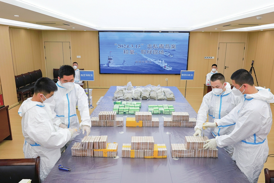 2024年3月,福建海警局破获一起特大走私毒品案,海警执法员对涉案毒品称量、取样。(中国海警局供图)
