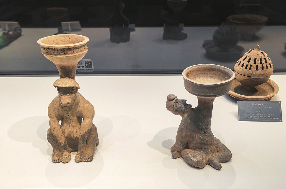 6月19日,在广西合浦汉代文化博物馆展出的东汉马座陶灯和胡人俑座陶灯等文物。新华社记者黄浩铭摄