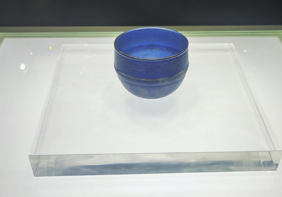 6月19日在广西合浦汉代文化博物馆展出的西汉晚期深蓝色玻璃杯。新华社记者黄浩铭摄