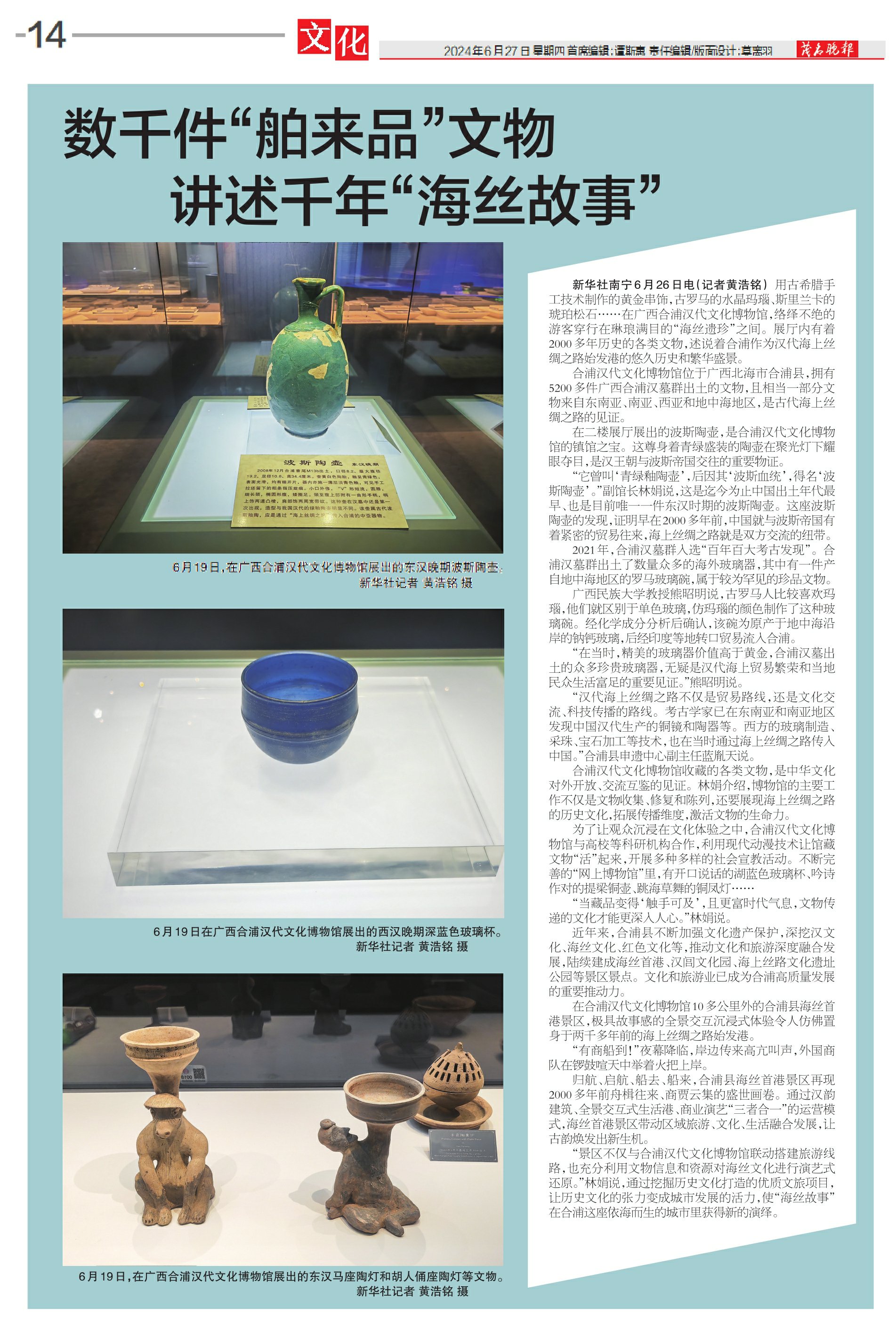 “汉代海上丝绸之路不仅是贸易路线,还是文化交流、科技传播的路线。考古学家已在东南亚和南亚地区发现中国汉代生产的铜镜和陶器等。西方的玻璃制造、采珠、宝石加工等技术,也在当时通过海上丝绸之路传入中国。”合浦县申遗中心副主任蓝胤天说。