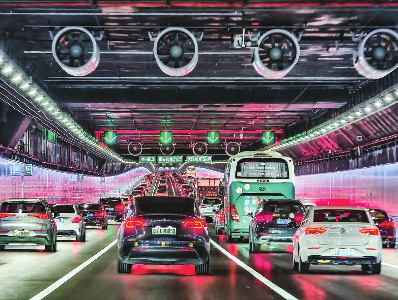 这是开通首日的深中通道海底沉管隧道内的车流(6月30日摄)。