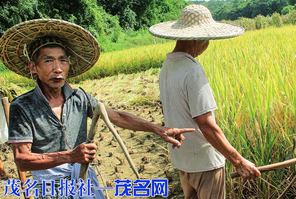 近日,在高州市谢鸡镇石塘村北面农田中,村民们正忙着收割水稻、花生,二位老人在一小块地上收割水稻时与旁人作法明显不同,用的是至少是50年前的农具。二位老人是自诩为“村夫”的丁汝文及其老伴何姨。