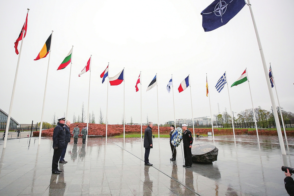 这是4月4日在比利时布鲁塞尔北约总部拍摄的北约成立75周年敬献花篮仪式。新华社记者 赵丁喆 摄
