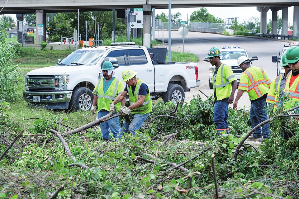 ▲7月9日,在美国得克萨斯州休斯敦,工人清理公路上的树枝。新华社发(陈晨摄)