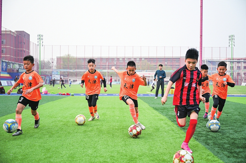 2024 年 4月11日,青少年球员在天津市足协青训基地训练。新华社记者孙凡越摄