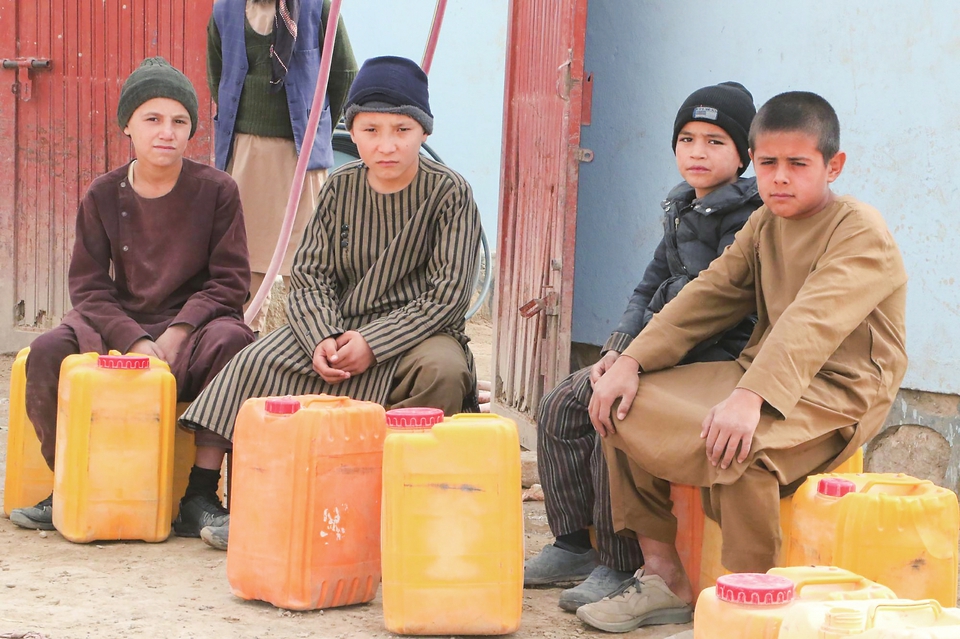 2023年11月22日,在阿富汗朱兹詹省,儿童坐在水桶旁。新华社发(艾哈迈德摄)