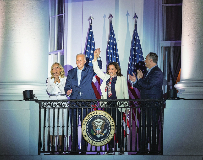 这是7月4日在美国华盛顿白宫拍摄的美国总统拜登(左二)和副总统哈里斯(右二)。新华社记者胡友松摄
