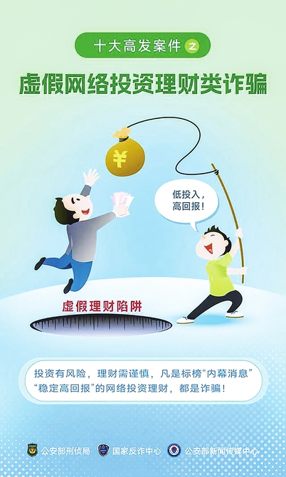 三、虚假网络投资理财类诈骗。不法分子假借债券投资、股票投资、贵金属投资、期货投资等概念,在网络平台发布消息宣称“稳赚不赔”,吸引群众关注。并将个人拉入“投资”群聊,然后冒充投资导师、理财专家,以“专家内幕”虚假消息诱导投资,或通过婚恋交友平台与个人确定婚恋关系,再以有“内部消息”“特殊资源”等诱骗个人参与投资,引导个人在伪造或仿冒的投资平台进行投资,并以小额投资返利作为诱饵,不断引导个人加大资金投入,随后迅速转移资金。