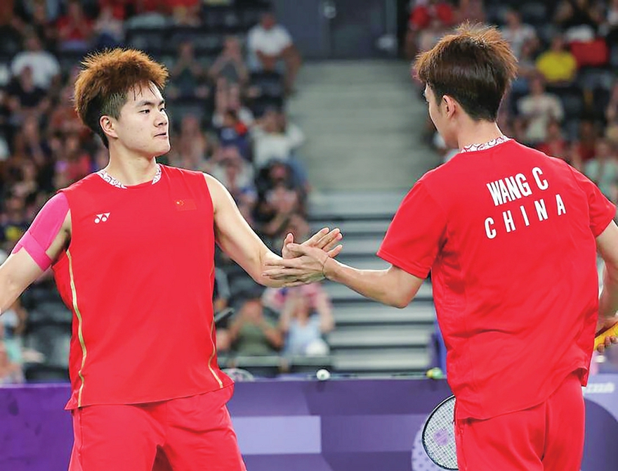 7月29日,中国组合梁伟铿(左)/王昶在比赛中庆祝得分。 新华社记者陈斌摄