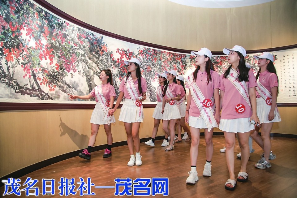“没想到荔枝居然有这么多品种!”“原来一棵树上可以结这么多荔枝。”……当天采风的第一站,选手们来到中国荔枝博览馆,在看到图文并茂、丰富多彩的荔枝文化展示,不少选手都大为赞叹,目不暇接,欣赏每一处的展出内容。馆内的布展追溯了荔枝的起源与传播、荔枝相关的名人轶事和历史典故,还延伸至古代艺术品及当代非遗中的荔枝形象,并以荔史、荔事、荔知、荔人、荔业、荔韵、荔梦为布展脉络,展示我市乃至我国荔枝产业的发展历程及成就。馆内丰富的图文、实物展览和场景还原,让选手们对茂名荔枝古韵、荔枝对茂名的发展促进有了实际深刻的理解与体会。不仅如此,选手们漫步于馆区的空中栈桥,抬头望去,入眼尽是郁郁葱葱的荔枝树,与背后仿唐样式的博览馆主体建筑遥相呼应,让她们感受到这座城市的历史气息与现代生机的有机融合。