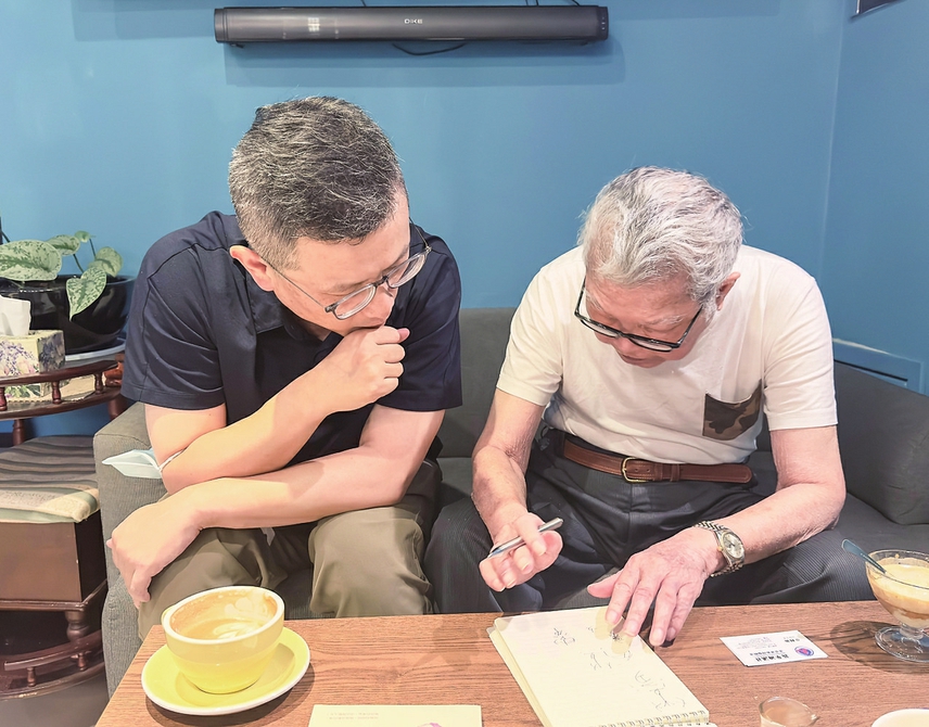 许进雄(右)在台北接受新华社记者(左)的采访(6月28日摄)。新华社记者 王承昊 摄