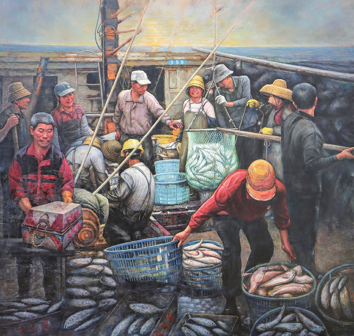 《南海渔汛》210ⅹ220cm,生动描绘了南海晨早,海上一轮红日半露,一群南海湾的渔民在刚刚从海上打渔回来的在渔船上起渔的场景,从海里打捞上来满满闪闪发光的一网渔,渔民忙碌的身影,脸上却露出丰收的喜悦,渔民海上打渔起早摸黑,不畏辛劳,在晨光中,有说有笑忙前忙后、线上线下同心同力、如诗如画,如同一首表现劳动人民的交响曲。