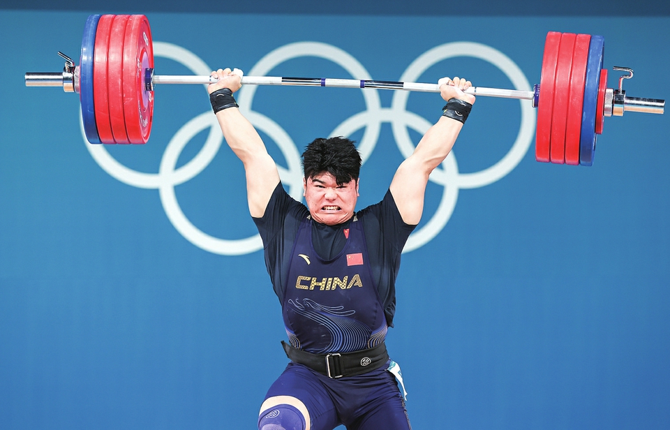 8月10日,中国选手刘焕华在比赛中。当日,在巴黎奥运会举重项目男子102公斤级比赛中,中国选手刘焕华夺得冠军。