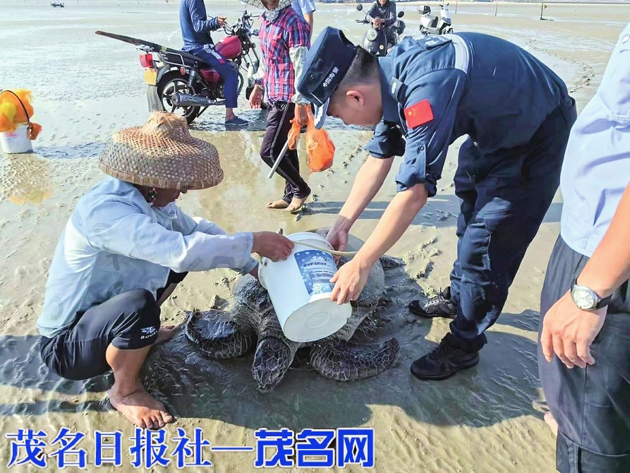 茂名晚报讯 记者 刘锋兰 通讯员 陈新元 赵晶华 近日,广东茂名海警局滨海工作站联合驻地博贺派出所,与群众一起在博贺港放鸡岛旅游码头附近海域成功救助一只搁浅海龟,并将其放生回归海洋。据了解,这只海龟重达150多公斤,被救时已脱水严重极度虚弱。
