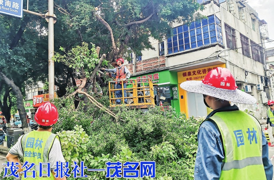昨天,在市区红旗南路,园林工人利用吊臂车抓紧修剪马路两旁的高大路树,防止粗大枯枝坠落时发生伤人意外,做好台风雨季的预防措施。