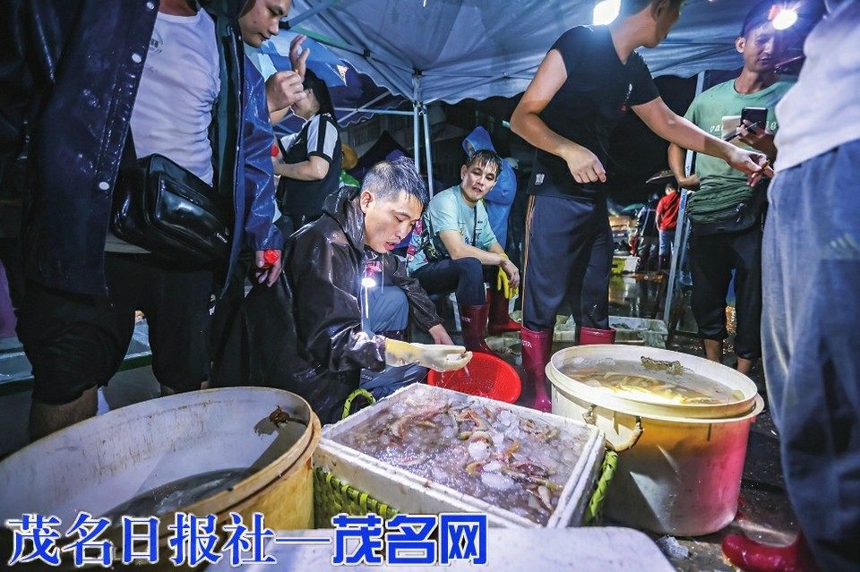凌晨4时许,当大多数人还沉浸在梦乡之中,博贺渔港却早已苏醒,码头灯火通明、人声鼎沸。每当有渔船靠岸,渔民们身着防水衣,动作麻利地将一筐筐、一箱箱鲜活的渔获搬运上岸。记者在现场看到,这些渔获中,有各个品种的海鱼、大虾、螃蟹、花螺、鱿鱼等,各式各样的海产品琳琅满目,让人目不暇接。