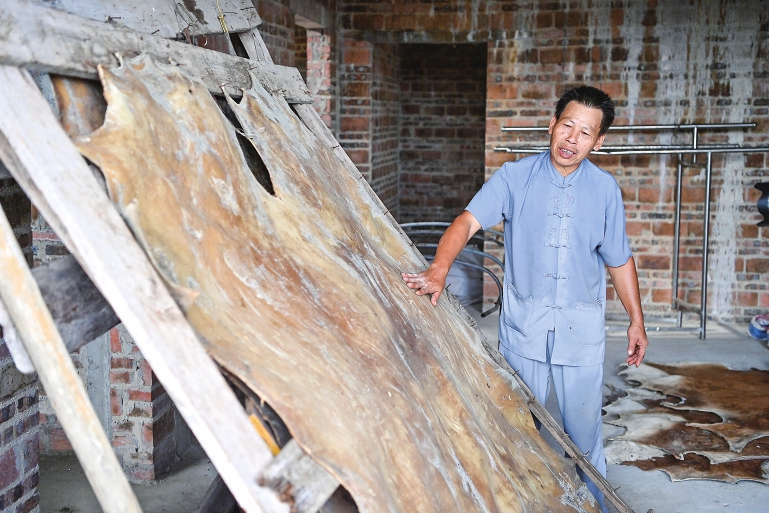 ▲施绍汉在查看晾晒的牛皮,准备制作烟墩大鼓(8月15日摄)。
