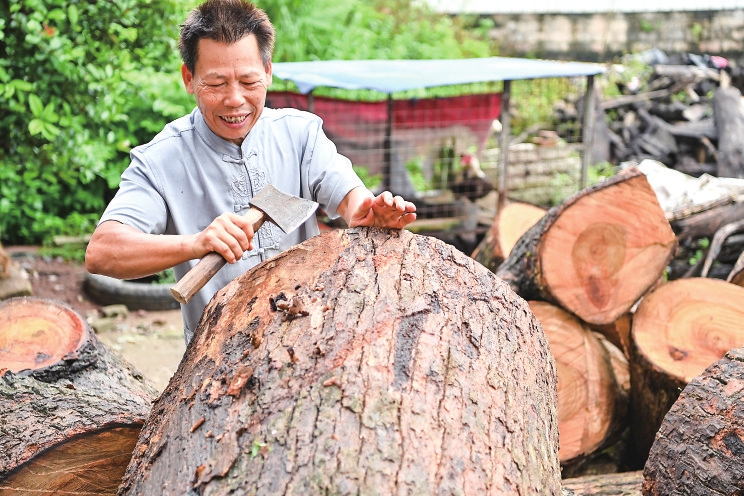 ▲施绍汉在给木头去皮,准备制作烟墩大鼓(8月15日摄)。