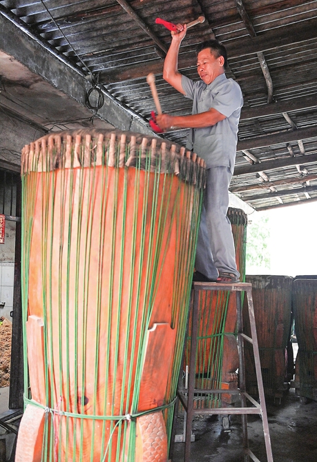 新华社电“我八九岁开始跟着爷爷学鼓,40多年来制作了大大小小的鼓2000多面。如今,几个孙子也在放假时跟着学做鼓。我相信,烟墩大鼓的制作技艺一定会一代代传下去的。”广西灵山县烟墩镇六加村委沙塘村村民施绍汉说。