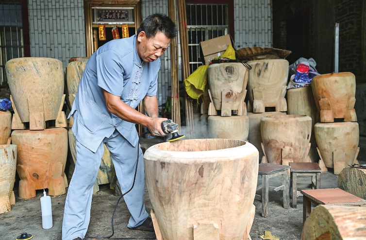 ▲施绍汉在打磨木头,制作烟墩大鼓(8月15日摄)。