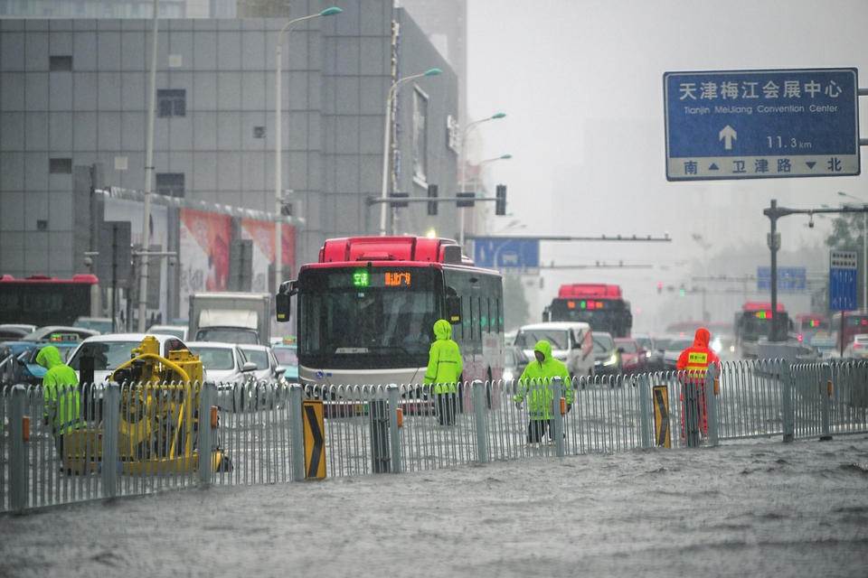 8月26日,交警及应急排水工作人员在天津市南开区海光寺地区进行地面交通疏导及应急排水作业。 新华社记者孙凡越摄