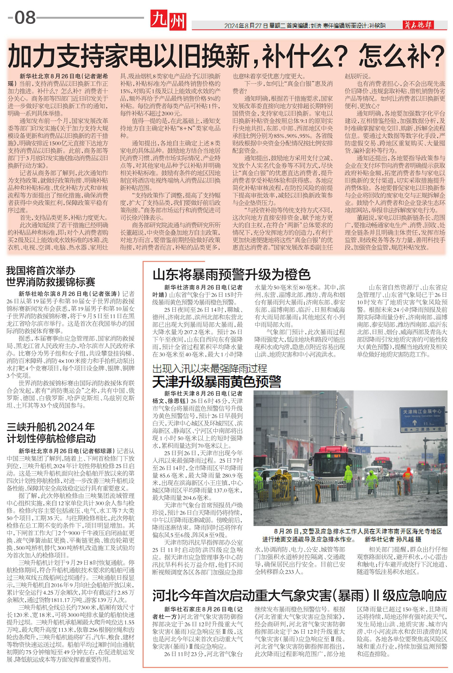 新华社天津8月26日电(记者杨文、徐思钰)26日6时45分,天津市气象台将暴雨蓝色预警信号升级为黄色预警信号,预计26日早晨到白天,天津中心城区及环城四区、滨海新区、静海区、宁河区中南部将出现1小时50毫米以上的短时强降水,累积雨量达到70毫米以上。
