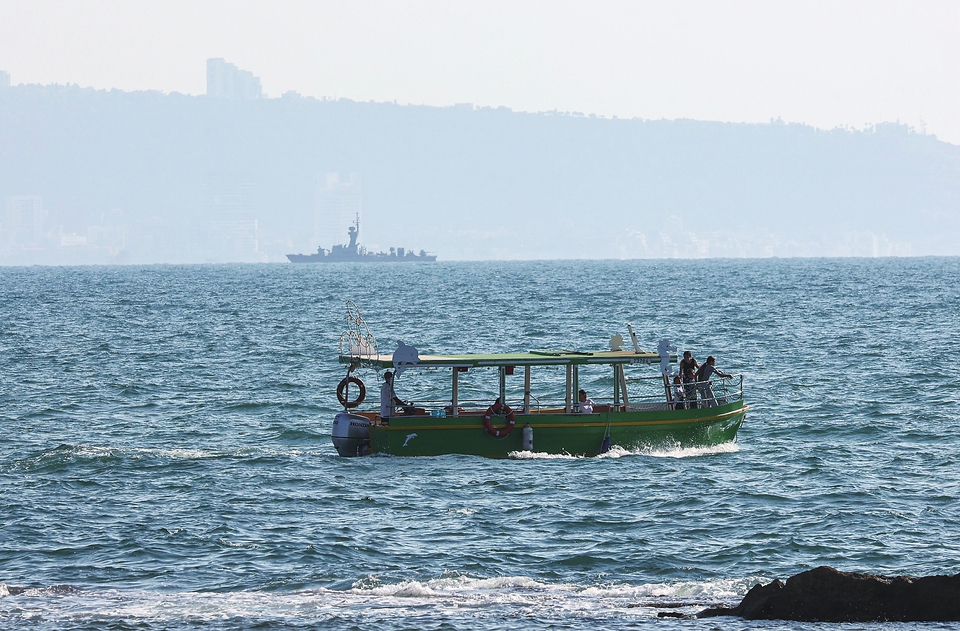 8月25日,在以色列北部城市阿卡,以色列军舰在海岸附近游弋。新华社发(吉尔·科恩·马根摄)