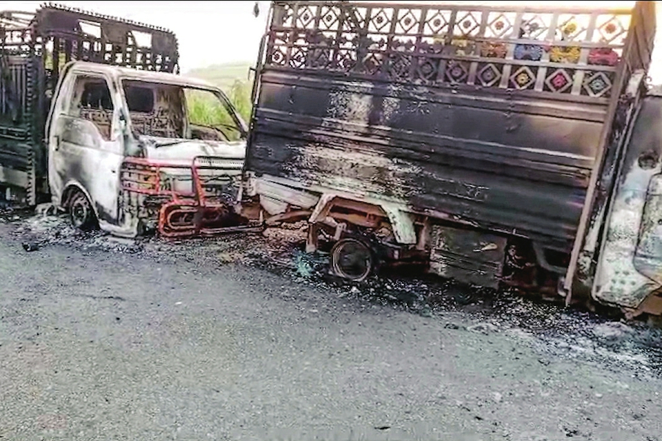 这是8月26日在巴基斯坦俾路支省穆萨海勒地区拍摄的被烧毁的车辆(手机照片)。 新华社发