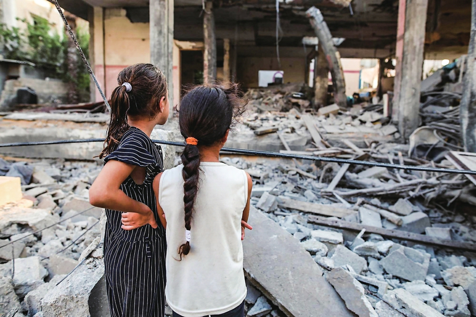 8月31日,在加沙地带中部努赛赖特难民营,两名女孩查看以军轰炸后的建筑废墟。新华社发(马尔万·达乌德摄)