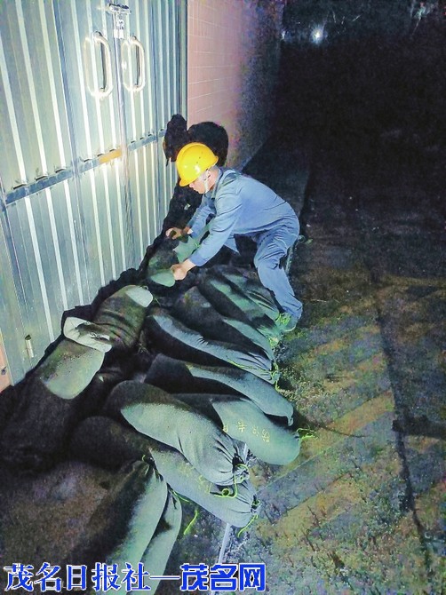 茂名茂港供电局沙院供电所对港城开关站、码头开关站、恒和配电站等重要供电设备设施场所进行门窗加固以及沙袋封堵工作。 易华富 摄