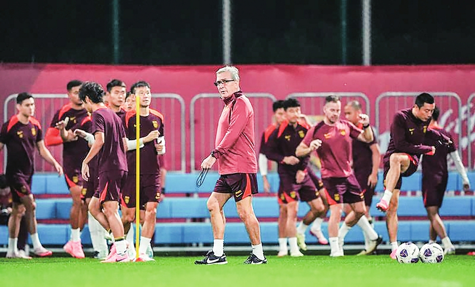 9月7日,中国队主教练伊万科维奇(中)指挥球员训练。新华社记者李钢摄