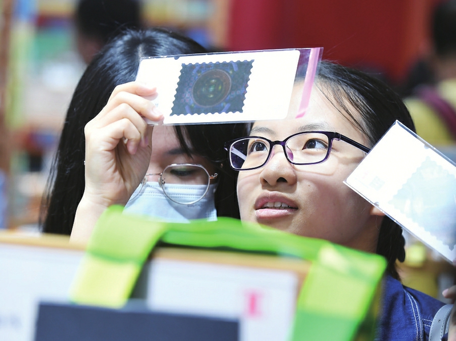9 月 16日,在服贸会首钢园文旅服务专题展区,一名参观者近距离观看一款由北京古代建筑博物馆送展的文创产品。 新华社记者 逯阳 摄
